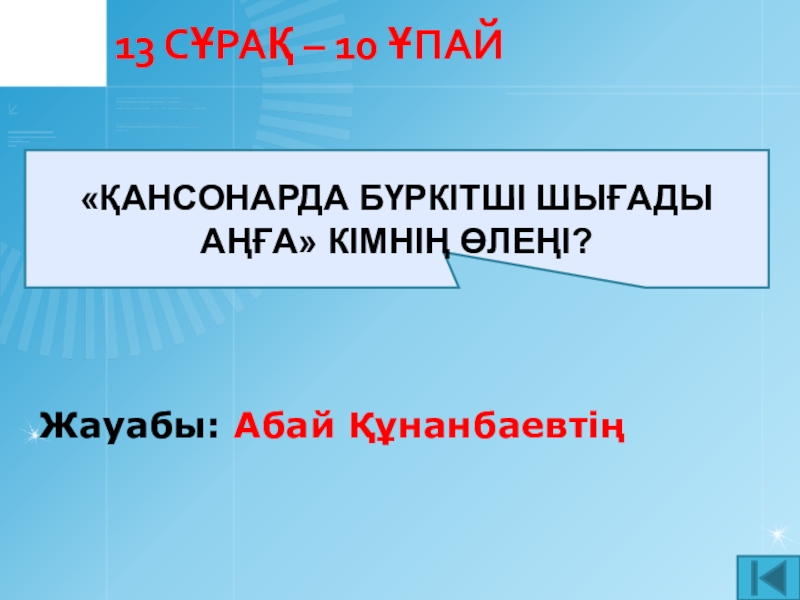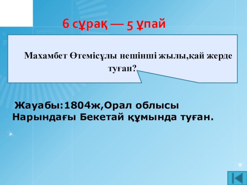Жауабы:1804ж,Орал облысы Нарындағы Бекетай құмында туған.