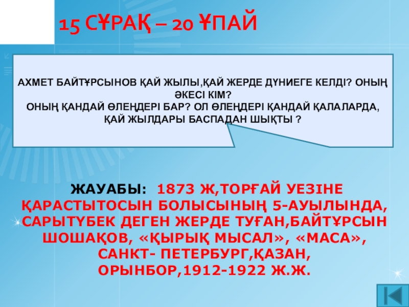 ЖАУАБЫ: 1873 Ж,ТОРҒАЙ УЕЗІНЕ ҚАРАСТЫТОСЫН БОЛЫСЫНЫҢ 5-АУЫЛЫНДА,САРЫТҮБЕК ДЕГЕН ЖЕРДЕ ТУҒАН,БАЙТҰРСЫН ШОШАҚОВ, «ҚЫРЫҚ МЫСАЛ», «МАСА»,САНКТ- ПЕТЕРБУРГ,ҚАЗАН,ОРЫНБОР,1912-1922 Ж.Ж.