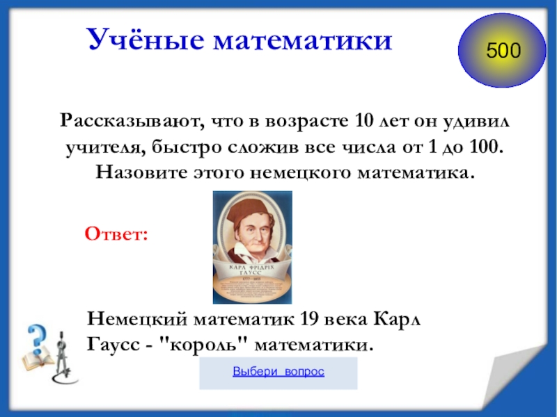 Немецкий математик 19 века Карл Гаусс - "король" математики.