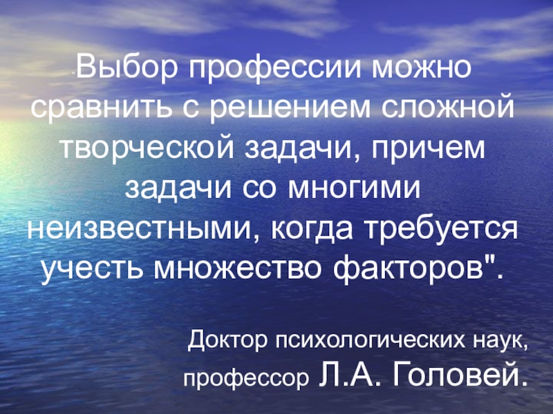 "Выбор профессии можно сравнить с решением сложной творческой задачи, причем задачи со многими неизвестными, когда требуется учесть множество факторов". Доктор психологических наук, профессор Л.А. Головей.