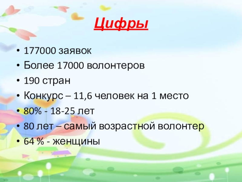 Цифры 177000 заявокБолее 17000 волонтеров190 странКонкурс – 11,6 человек на 1 место80% - 18-25 лет80 лет –