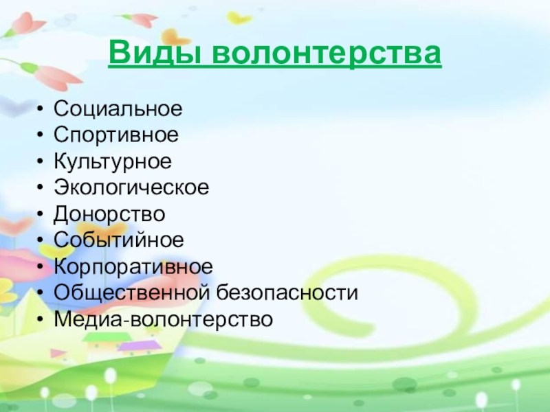 Виды волонтерстваСоциальноеСпортивноеКультурноеЭкологическоеДонорствоСобытийноеКорпоративное Общественной безопасностиМедиа-волонтерство