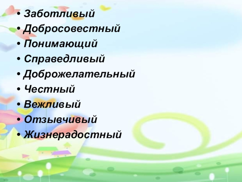 ЗаботливыйДобросовестныйПонимающийСправедливыйДоброжелательныйЧестныйВежливыйОтзывчивыйЖизнерадостный