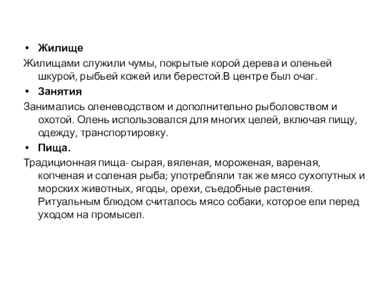 Жилищами служили чумы, покрытые корой дерева и оленьей шкурой, рыбьей кожей