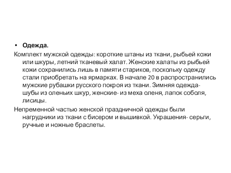 летний тканевый халат. Женские халаты из рыбьей кожи сохранились лишь в памяти стариков, поскольку одежду стали приобретать на ярмарках. В начале 20 в распространились мужские рубашки русского покроя из ткани. Зимняя одежда- шубы из оленьих шкур, женские- из меха оленя, лапок соболя, лисицы.