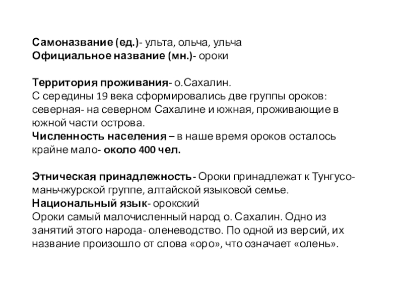 Ороки самый малочисленный народ о. Сахалин. Одно из занятий этого народа- оленеводство. По одной из версий, их название произошло от слова «оро», что означает «олень».