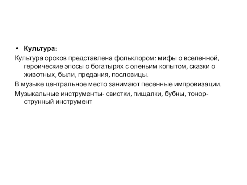 Культура ороков представлена фольклором: мифы о вселенной, героические эпосы о богатырях
