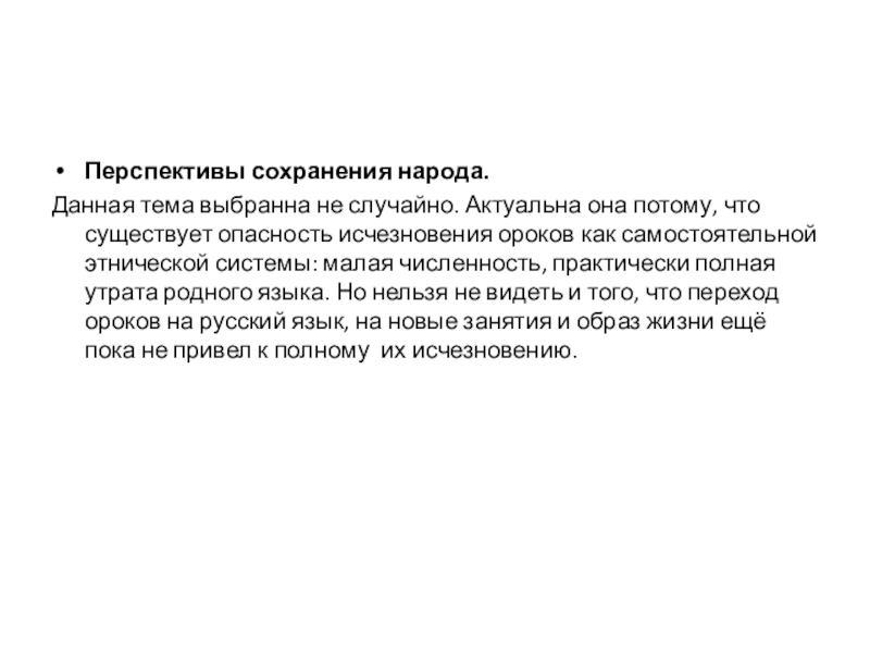 существует опасность исчезновения ороков как самостоятельной этнической системы: малая численность, практически полная утрата родного языка. Но нельзя не видеть и того, что переход ороков на русский язык, на новые занятия и образ жизни ещё пока не привел к полному их исчезновению.