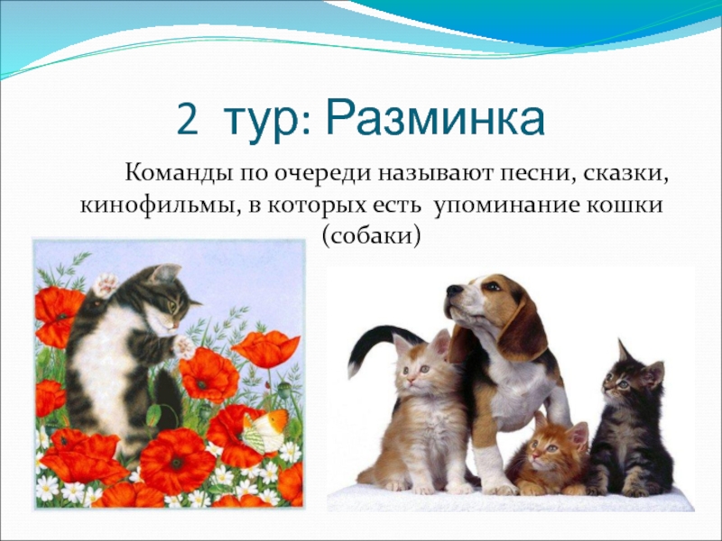 2 тур: Разминка		Команды по очереди называют песни, сказки, кинофильмы, в которых есть упоминание кошки (собаки)