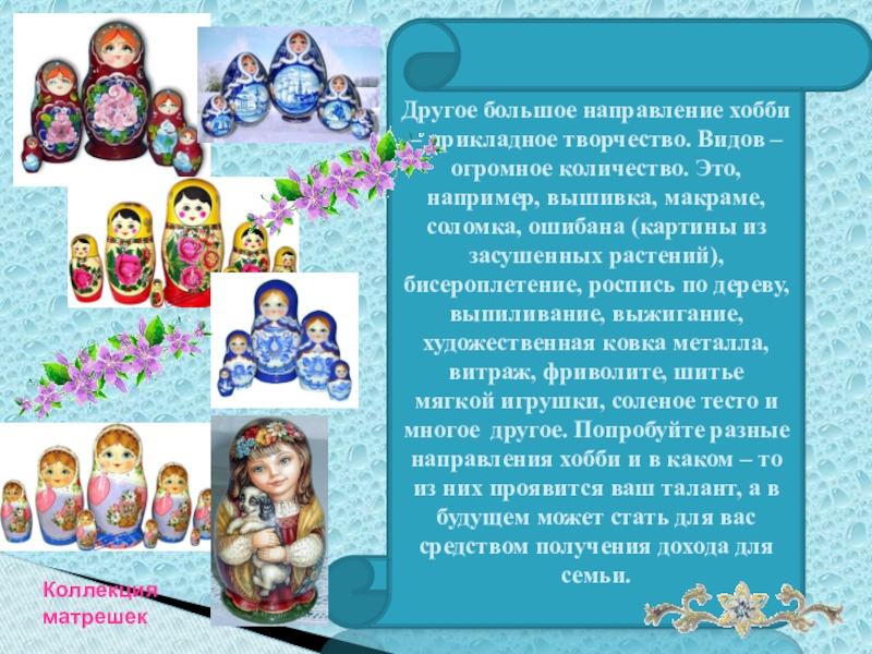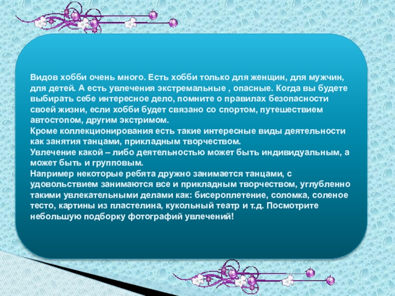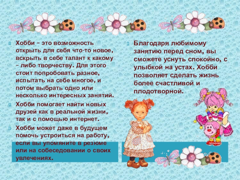 Благодаря любимому занятию перед сном, вы сможете уснуть спокойно, с улыбкой на устах. Хобби позволяет сделать жизнь более счастливой и плодотворной.