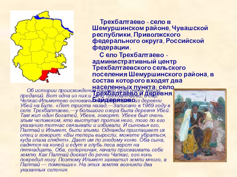 С ело Трехбалтаево - административный центр Трехбалтаевского сельского поселения Шемуршинского района, в состав которого входят два населенных пункта: село Трехбалтаево и деревня Байдеряково.