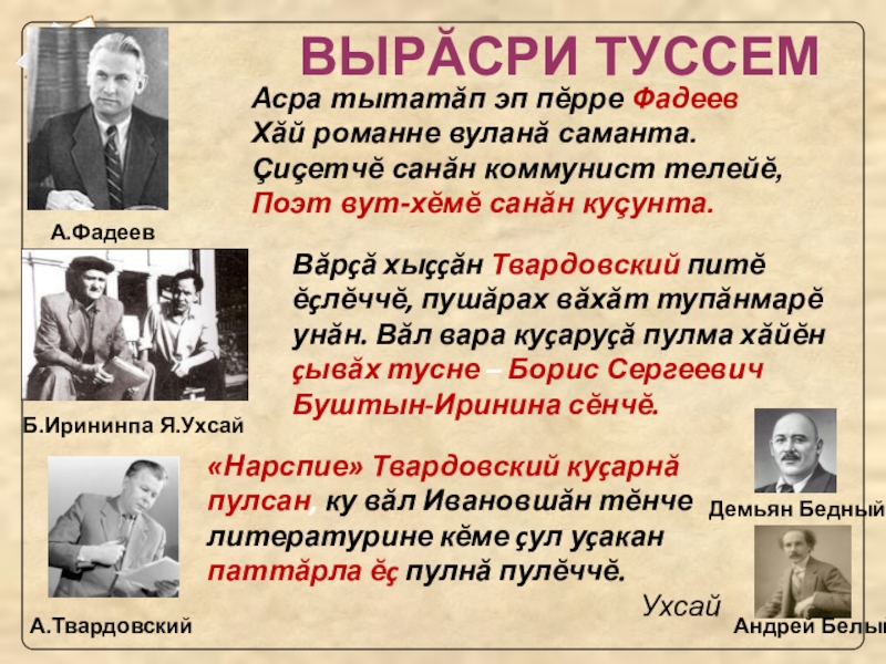 «Нарспие» Твардовский куçарнă пулсан, ку вăл Ивановшăн тĕнче литературине кĕме çул уçакан паттăрла ĕç пулнă пулĕччĕ.