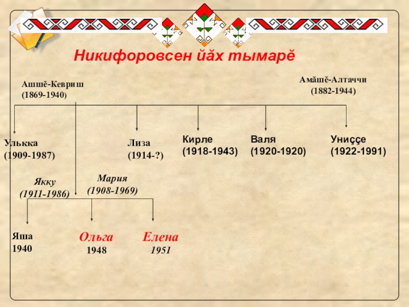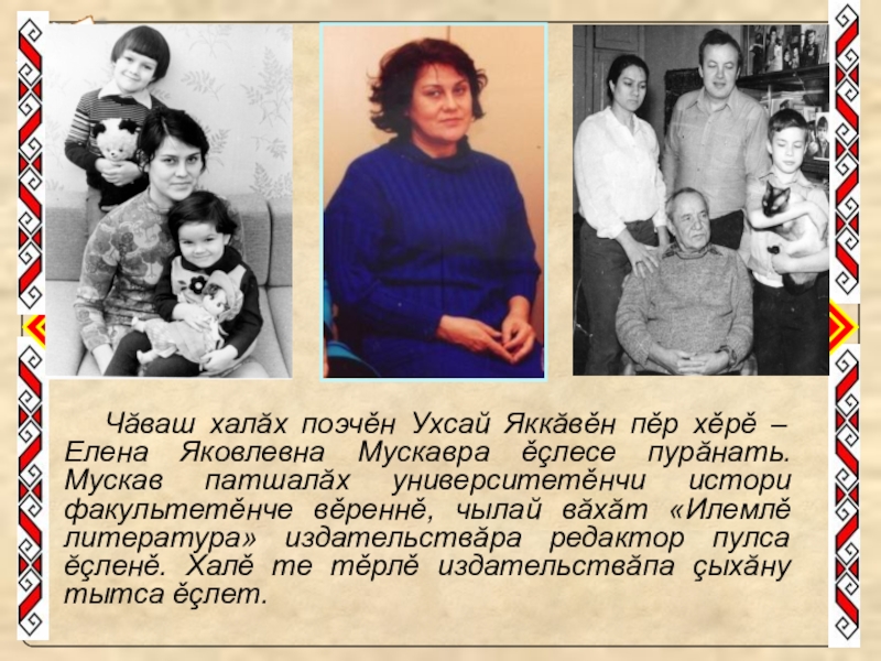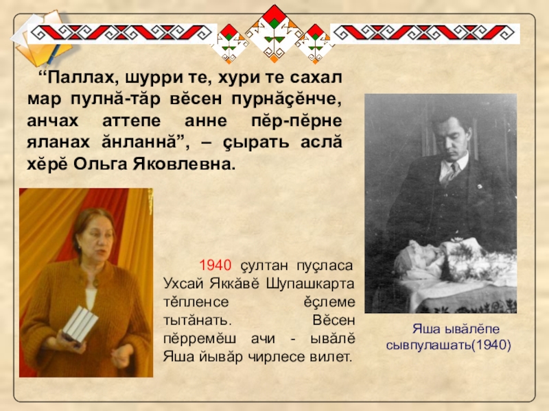 “Паллах‚ шурри те‚ хури те сахал мар пулнă-тăр вĕсен пурнăçĕнче‚ анчах аттепе анне пĕр-пĕрне яланах ăнланн㔂 – çырать аслă хĕрĕ Ольга Яковлевна.