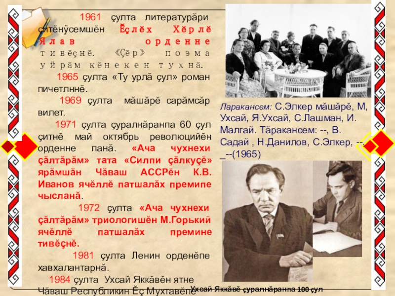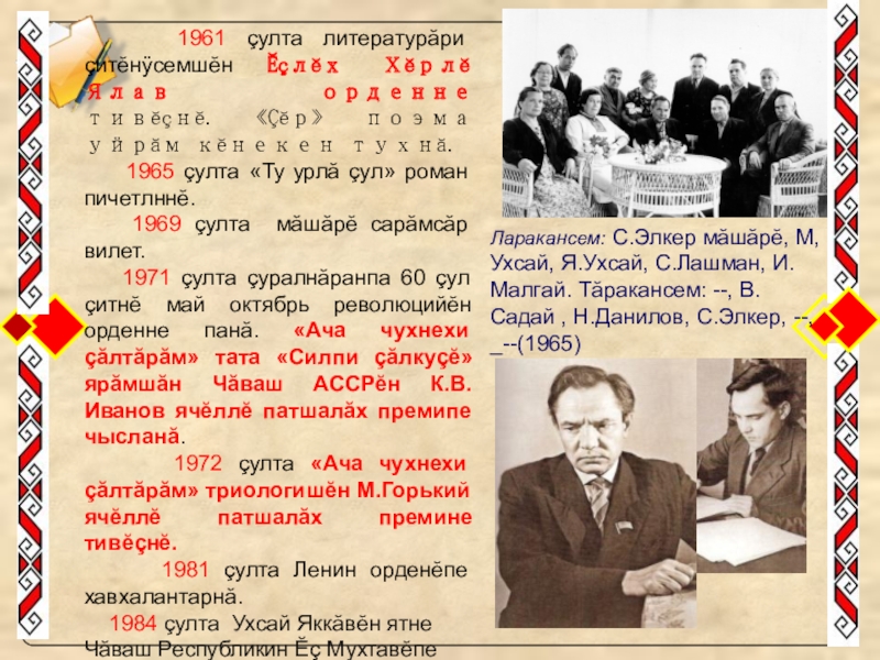 Ларакансем: С.Элкер мăшăрĕ, М,Ухсай, Я.Ухсай, С.Лашман, И.Малгай. Тăракансем: --, В.Садай , Н.Данилов, С.Элкер, --, _--(1965)