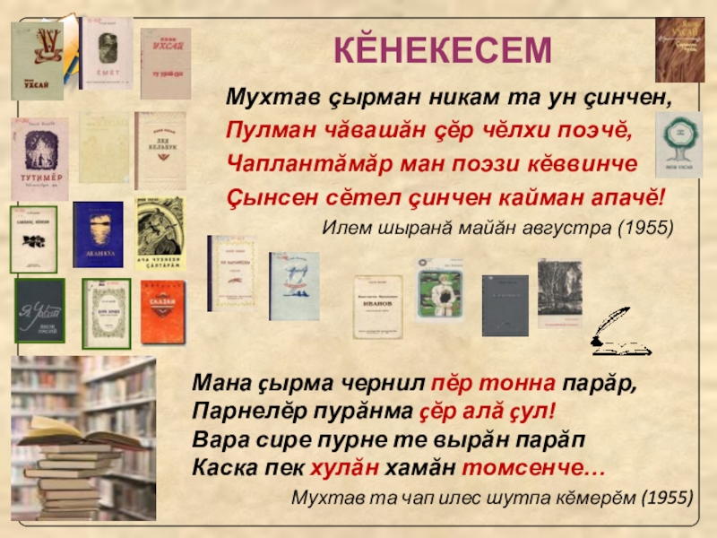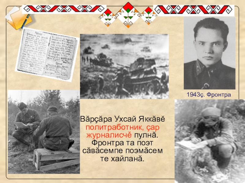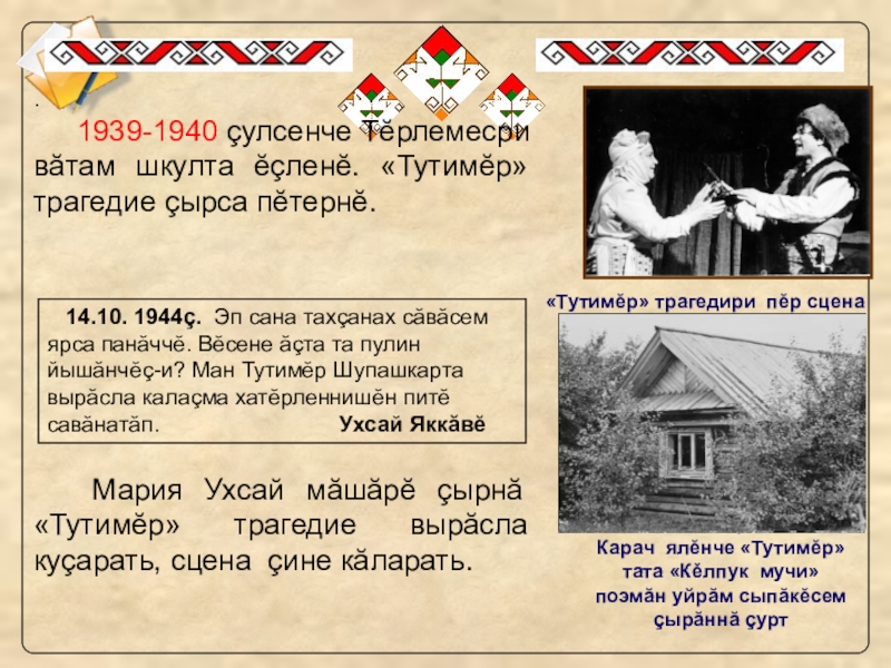 14.10. 1944ç. Эп сана тахçанах сăвăсем ярса панăччĕ. Вĕсене ăçта та пулин йышăнчĕç-и? Ман Тутимĕр Шупашкарта вырăсла калаçма хатĕрленнишĕн питĕ савăнатăп. Ухсай Яккăвĕ