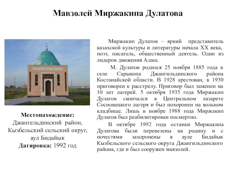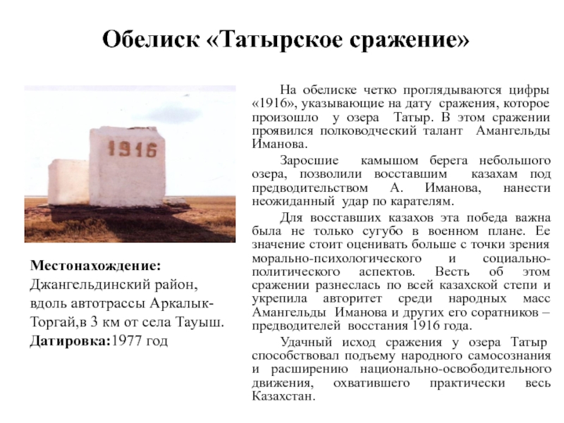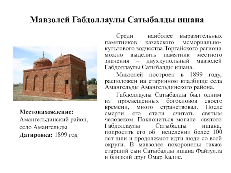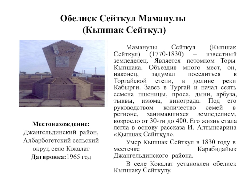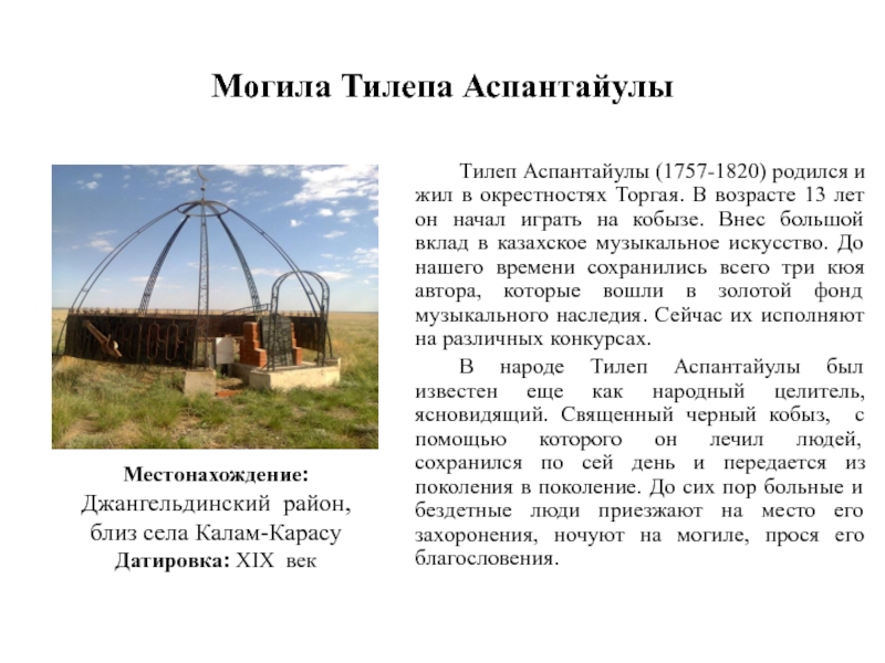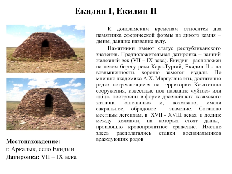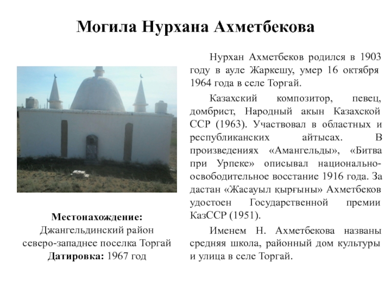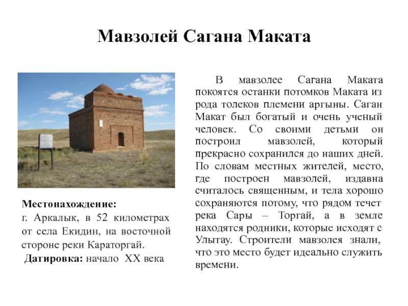 г. Аркалык, в 52 километрах от села Екидин, на восточной стороне реки Караторгай.