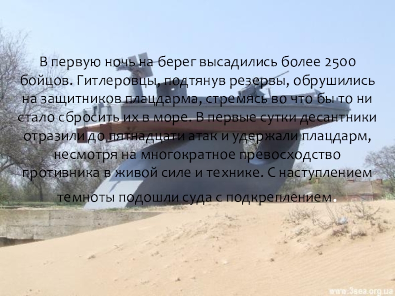 Слайд 15В первую ночь на берег высадились более 2500 бойцов. Гитлеровцы, подтянув