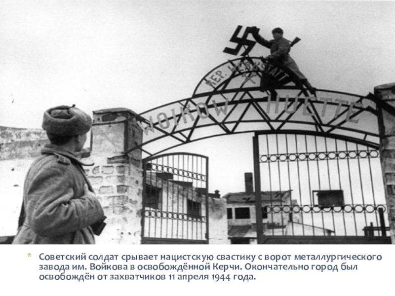 Слайд 20Советский солдат срывает нацистскую свастику с ворот металлургического завода им. Войкова
