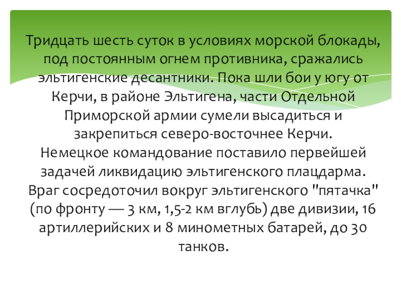 Слайд 16Тридцать шесть суток в условиях морской блокады, под постоянным огнем противника,