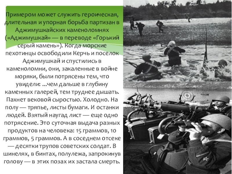 Слайд 4Примером может служить героическая, длительная и упорная борьба партизан в Аджимушкайских