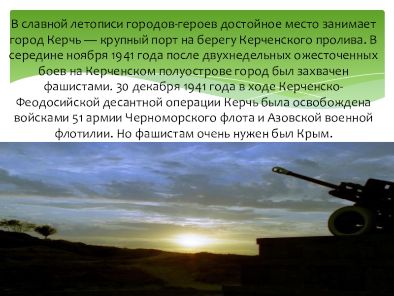 порт на берегу Керченского пролива. В середине ноября 1941 года после двухнедельных ожесточенных боев на Керченском полуострове город был захвачен фашистами. 30 декабря 1941 года в ходе Керченско-Феодосийской десантной операции Керчь была освобождена войсками 51 армии Черноморского флота и Азовской военной флотилии. Но фашистам очень нужен был Крым.