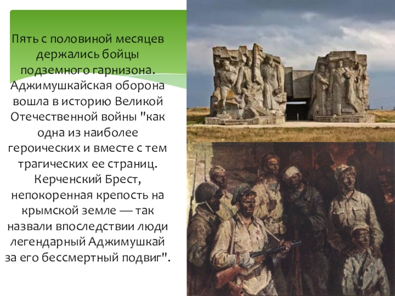 в историю Великой Отечественной войны "как одна из наиболее героических и вместе с тем трагических ее страниц. Керченский Брест, непокоренная крепость на крымской земле — так назвали впоследствии люди легендарный Аджимушкай за его бессмертный подвиг".