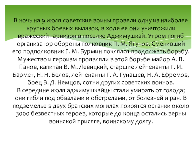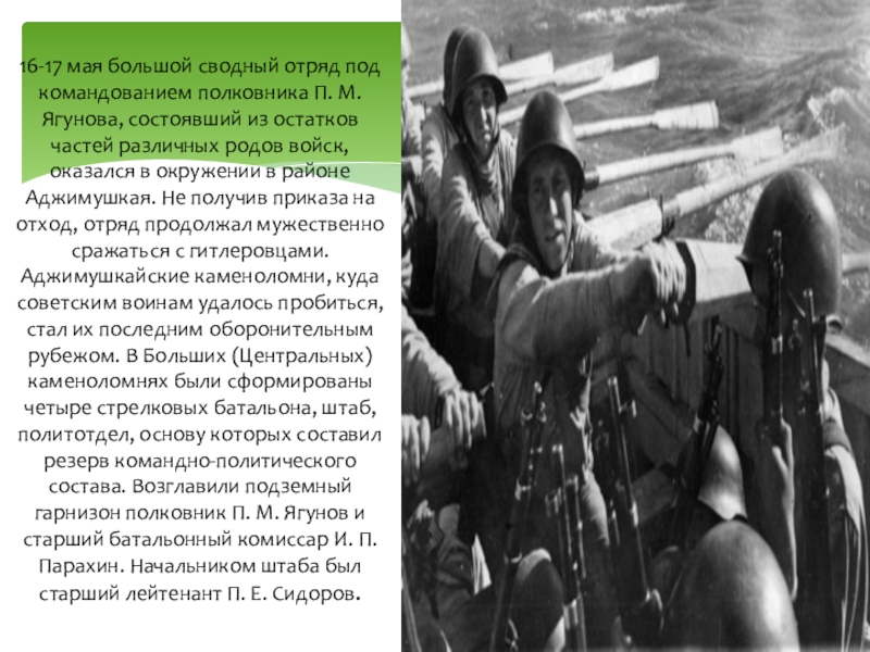крупных боевых вылазок, в ходе ее они уничтожили вражеский гарнизон в поселке Аджимушкай. Утром погиб организатор обороны полковник П. М. Ягунов. Сменивший его подполковник Г. М. Бурмин поклялся продолжать борьбу. Мужество и героизм проявляли в этой борьбе майор А. П. Панов, капитан В. М. Левицкий, старшие лейтенанты Г. И. Бармет, Н. Н. Белов, лейтенанты Г. А. Гунашев, Н. А. Ефремов, боец В. Д. Немцов, сотни других советских воинов.