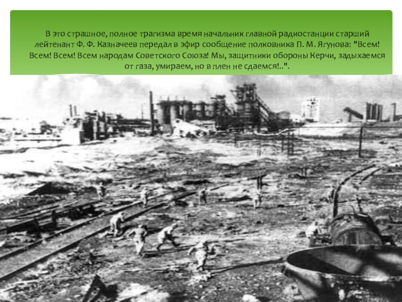 Ф. Ф. Казначеев передал в эфир сообщение полковника П. М. Ягунова: "Всем! Всем! Всем! Всем народам Советского Союза! Мы, защитники обороны Керчи, задыхаемся от газа, умираем, но в плен не сдаемся!..".
