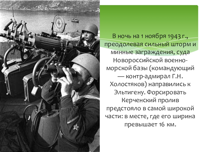 минные заграждения, суда Новороссийской военно-морской базы (командующий — контр-адмирал Г.Н. Холостяков) направились к Эльтигену. Форсировать Керченский пролив предстояло в самой широкой части: в месте, где его ширина превышает 16 км.