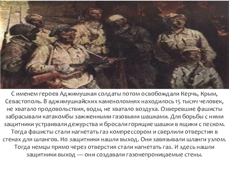 Слайд 5С именем героев Аджимушкая солдаты потом освобождали Керчь, Крым, Севастополь. В