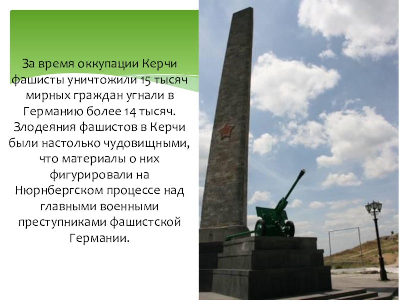 в Германию более 14 тысяч. Злодеяния фашистов в Керчи были настолько чудовищными, что материалы о них фигурировали на Нюрнбергском процессе над главными военными преступниками фашистской Германии.