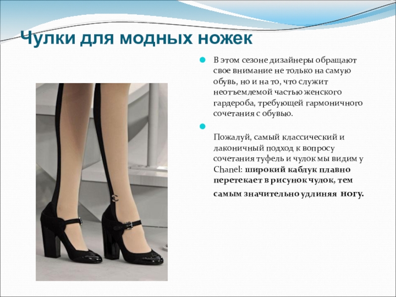 Пожалуй, самый классический и лаконичный подход к вопросу сочетания туфель и чулок мы видим у Chanel: широкий каблук плавно перетекает в рисунок чулок, тем самым значительно удлиняя ногу.