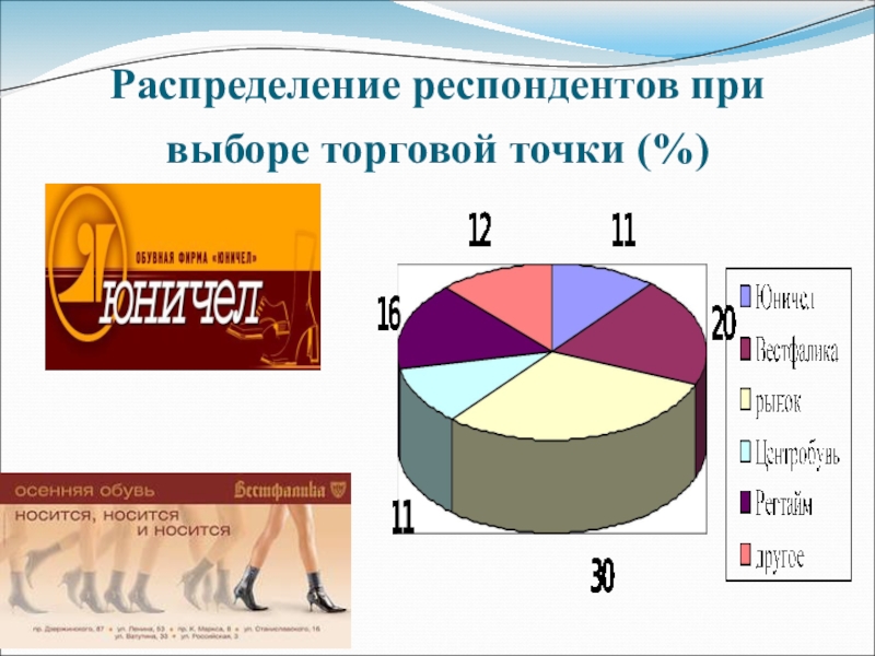 Слайд 66Распределение респондентов при выборе торговой точки (%)