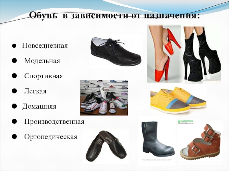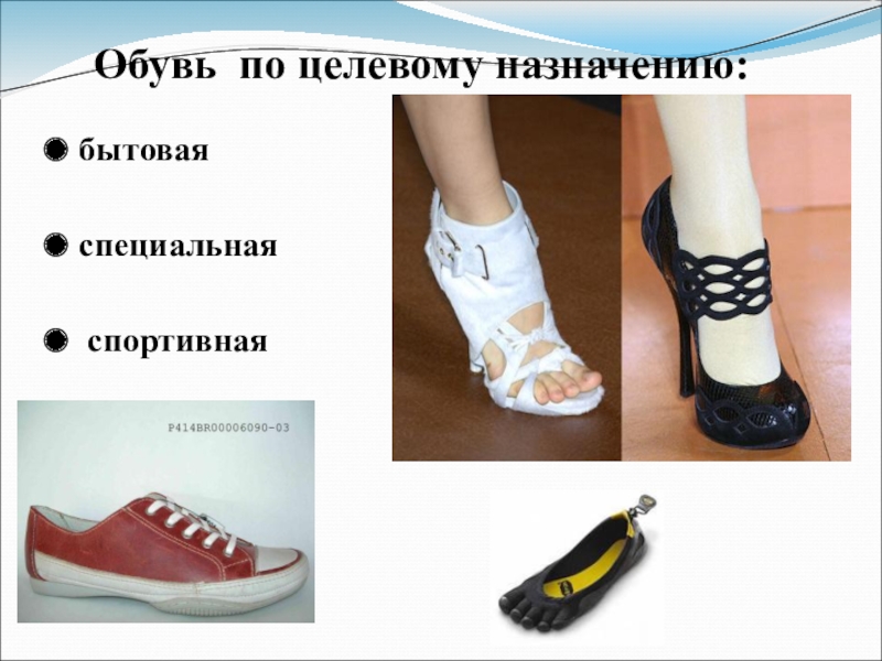 Слайд 9Обувь по целевому назначению: