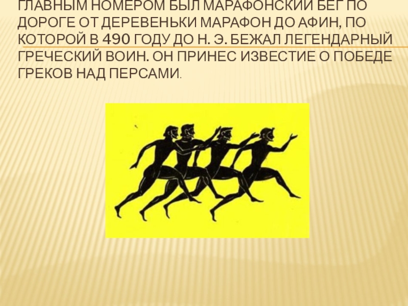Слайд 9Главным номером был марафонский бег по дороге от деревеньки Марафон до