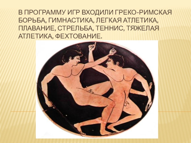 Слайд 7В программу игр входили греко-римская борьба, гимнастика, легкая атлетика, плавание, стрельба,
