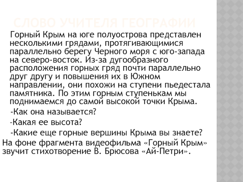 На фоне фрагмента видеофильма «Горный Крым» звучит стихотворение В. Брюсова «Ай-Петри».