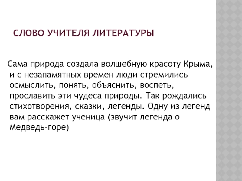 с незапамятных времен люди стремились осмыслить, понять, объяснить, воспеть, прославить эти чудеса природы. Так рождались стихотворения, сказки, легенды. Одну из легенд вам расскажет ученица (звучит легенда о Медведь-горе)