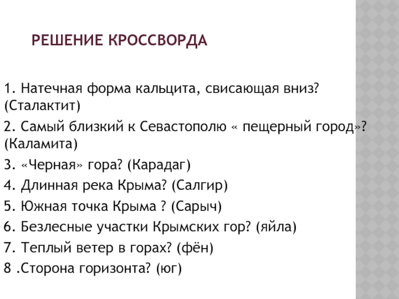В заключении мы с вами поднимемся на Роман-Кош. Кто первый достигнет этой вершины? (учащимся предлагается кроссворд, карточки лежат на каждой парте).