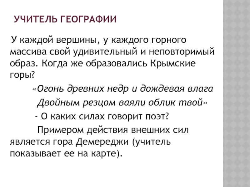Примером действия внешних сил является гора Демереджи (учитель показывает ее на карте).