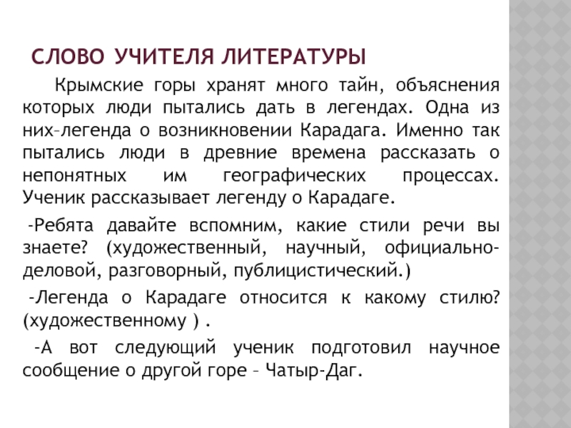 которых люди пытались дать в легендах. Одна из них–легенда о возникновении Карадага. Именно так пытались люди в древние времена рассказать о непонятных им географических процессах. Ученик рассказывает легенду о Карадаге.
