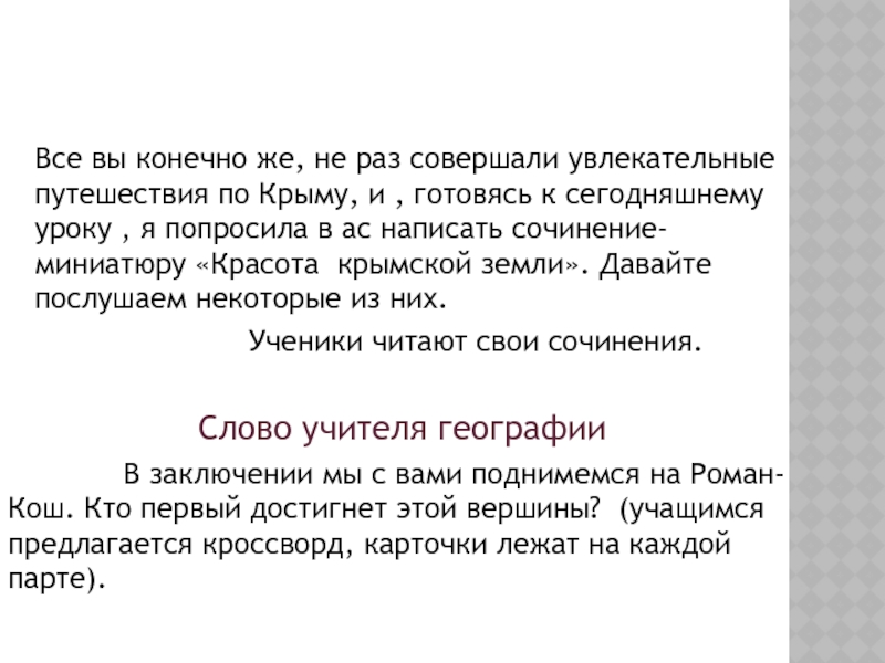 по Крыму, и , готовясь к сегодняшнему уроку , я попросила в ас написать сочинение-миниатюру «Красота крымской земли». Давайте послушаем некоторые из них.