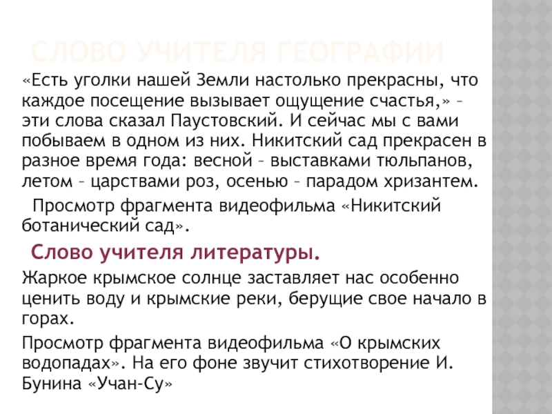 Просмотр фрагмента видеофильма «О крымских водопадах». На его фоне звучит стихотворение И.Бунина «Учан-Су»