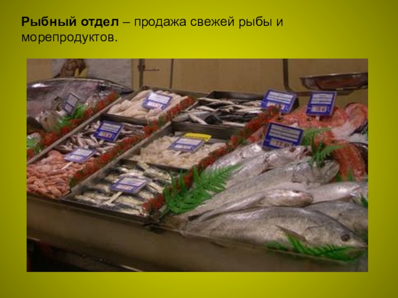 Рыбный отдел – продажа свежей рыбы и морепродуктов.