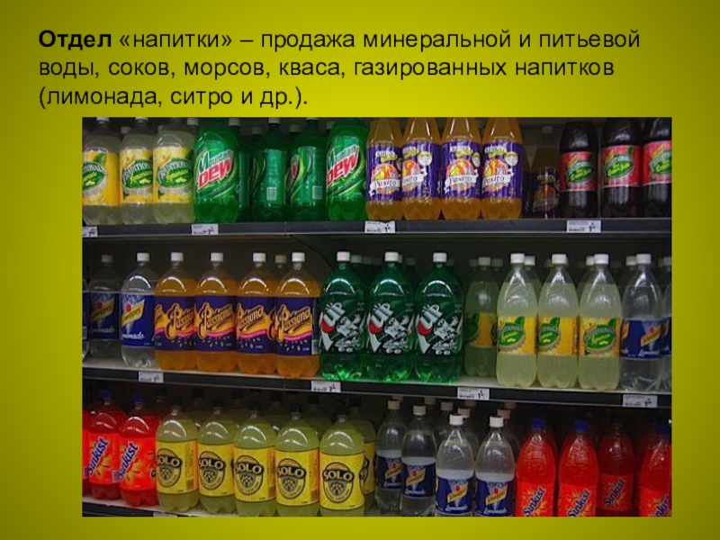 Отдел «напитки» – продажа минеральной и питьевой воды, соков, морсов, кваса, газированных напитков (лимонада, ситро и др.).