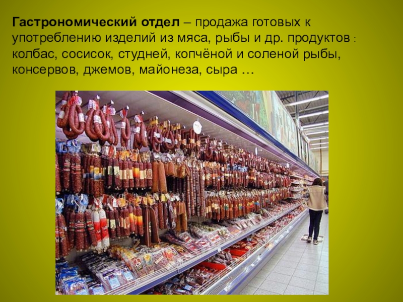 Гастрономический отдел – продажа готовых к употреблению изделий из мяса, рыбы и др. продуктов : колбас, сосисок,