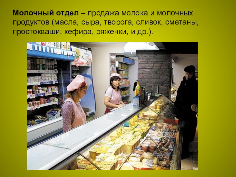 Молочный отдел – продажа молока и молочных продуктов (масла, сыра, творога, сливок, сметаны, простокваши, кефира, ряженки, и