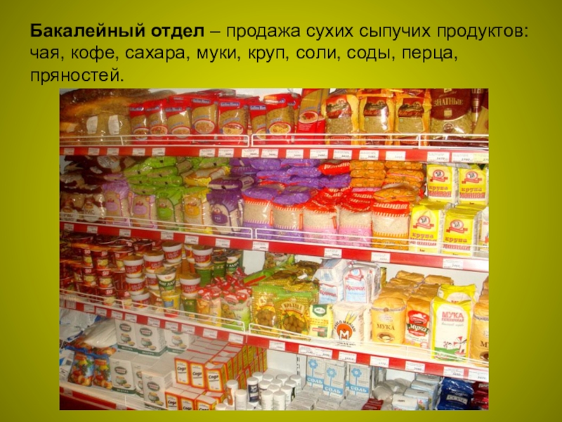 Бакалейный отдел – продажа cухих сыпучих продуктов: чая, кофе, сахара, муки, круп, соли, соды, перца, пряностей.