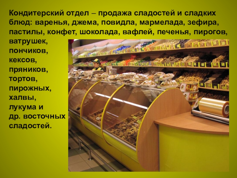 Кондитерский отдел – продажа сладостей и сладких блюд: варенья, джема, повидла, мармелада, зефира, пастилы, конфет, шоколада, вафлей,