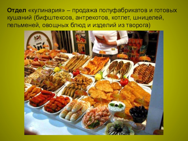 Отдел «кулинария» – продажа полуфабрикатов и готовых кушаний (бифштексов, антрекотов, котлет,
